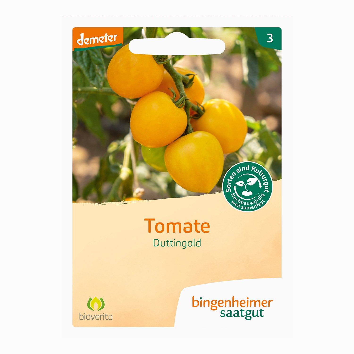 Pomodoro Duttingold, un pomodoro giallo chiaro dal sapore gradevolmente aromatico e acidulo. Questo pomodoro a crescita vigorosa è particolarmente adatto alla coltivazione in piena terra e si caratterizza per una vegetazione uniforme con un’elevata resistenza alla Phytophthora (Phytophthora peronospora tardiva). I frutti sodi sono notevolmente resistenti alle spaccature e, con un alto potenziale produttivo, il Pomodoro Duttingold è un’aggiunta preziosa a qualsiasi giardino.