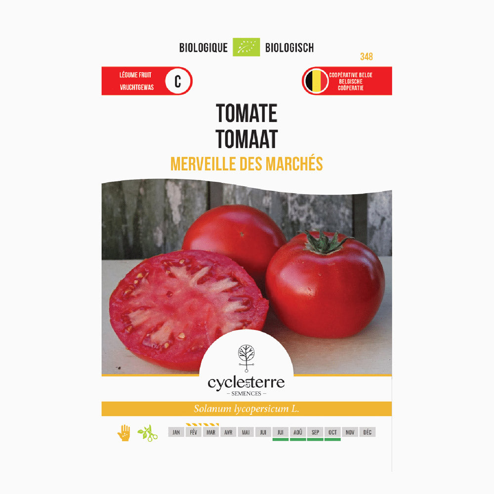 Per una crescita ottimale, semini 'Merveille des Marchés' da febbraio a marzo in un luogo caldo (18–24°C). Quando le giovani piantine hanno alcune foglie vere, le trapianti in vasi con un diametro di 8 cm. A partire dal 15 maggio, le piante possono essere trapiantate in serra o sotto una tettoia, con una distanza di impianto di 50 x 80 cm. Questo pomodoro cresce bene sia in piena terra sia in serra, e la stagione di raccolta va da metà luglio a ottobre, quando i pomodori sono completamente maturi e hanno sviluppato tutto il loro sapore.