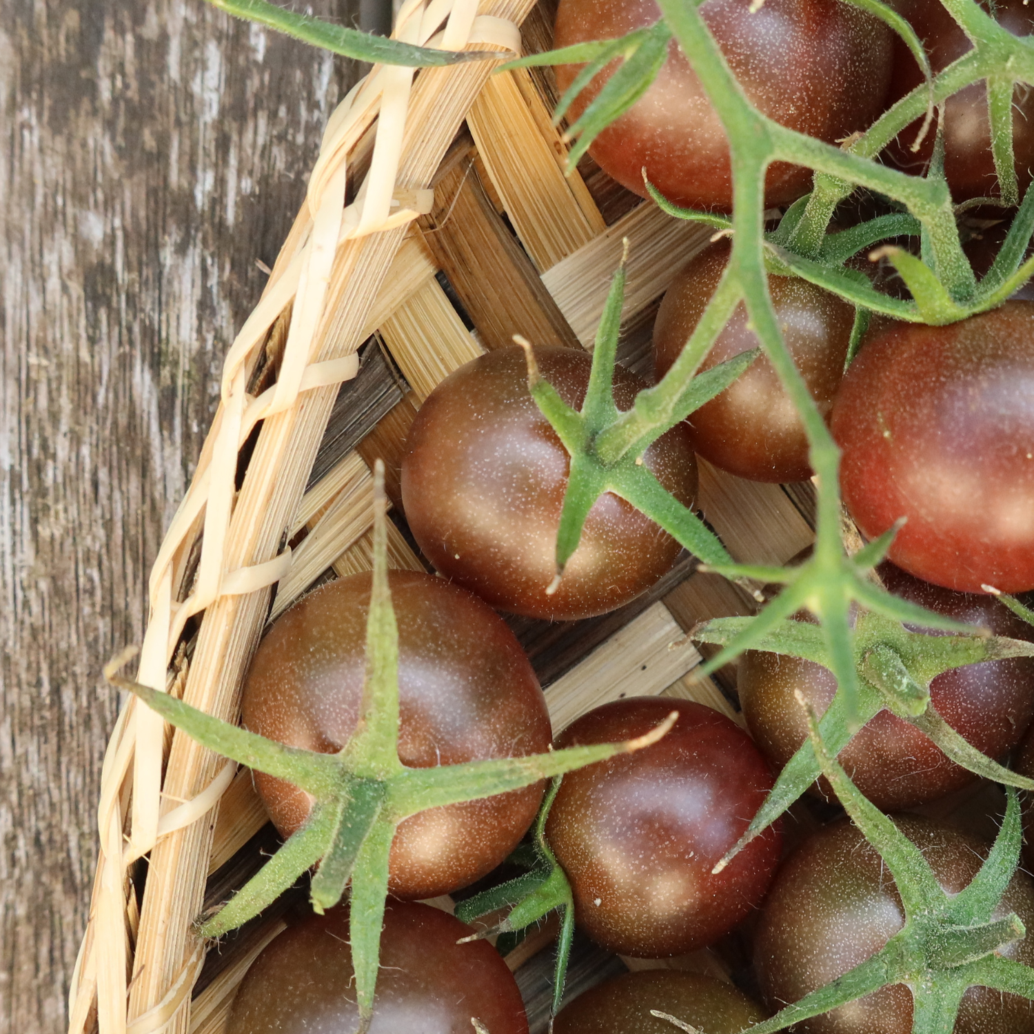 Kerstomaat Black Cherry, een tomatenvariëteit met een overvloed aan zoete vruchten met een licht zuurtje.  De chocoladekleurige vruchten, onderscheiden zich door hun heerlijk sappige, donkerrode vruchtvlees. Wat dit ras extra bijzonder maakt, is de capaciteit om een langdurige en overvloedige oogst van prachtig kleine vruchten te leveren, zonder snel open te barsten.