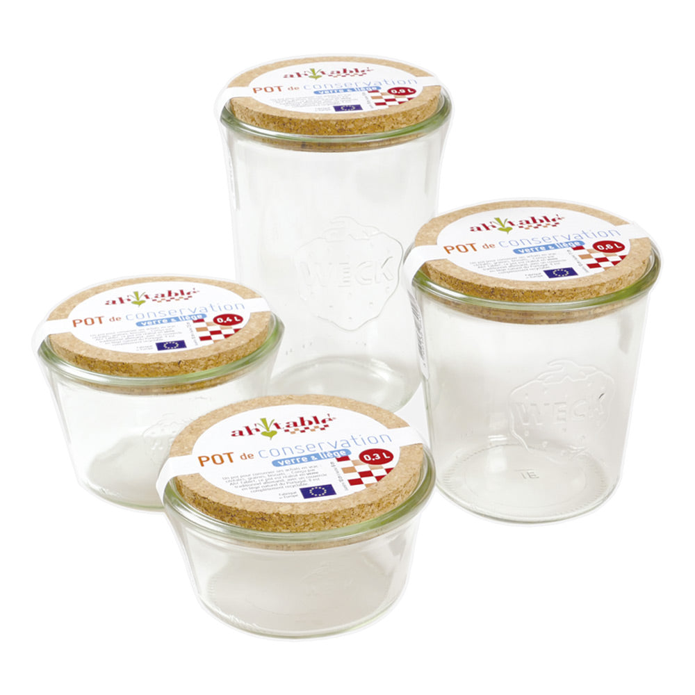 Een uniek design van het merk Ah Table en Duitse fabrikant Weck : inmaakpotten met kurken deksel. Deze potten zijn enkel geschikt voor het opslaan van droge producten en zijn niet geschikt om mee in te maken of te fermenteren.