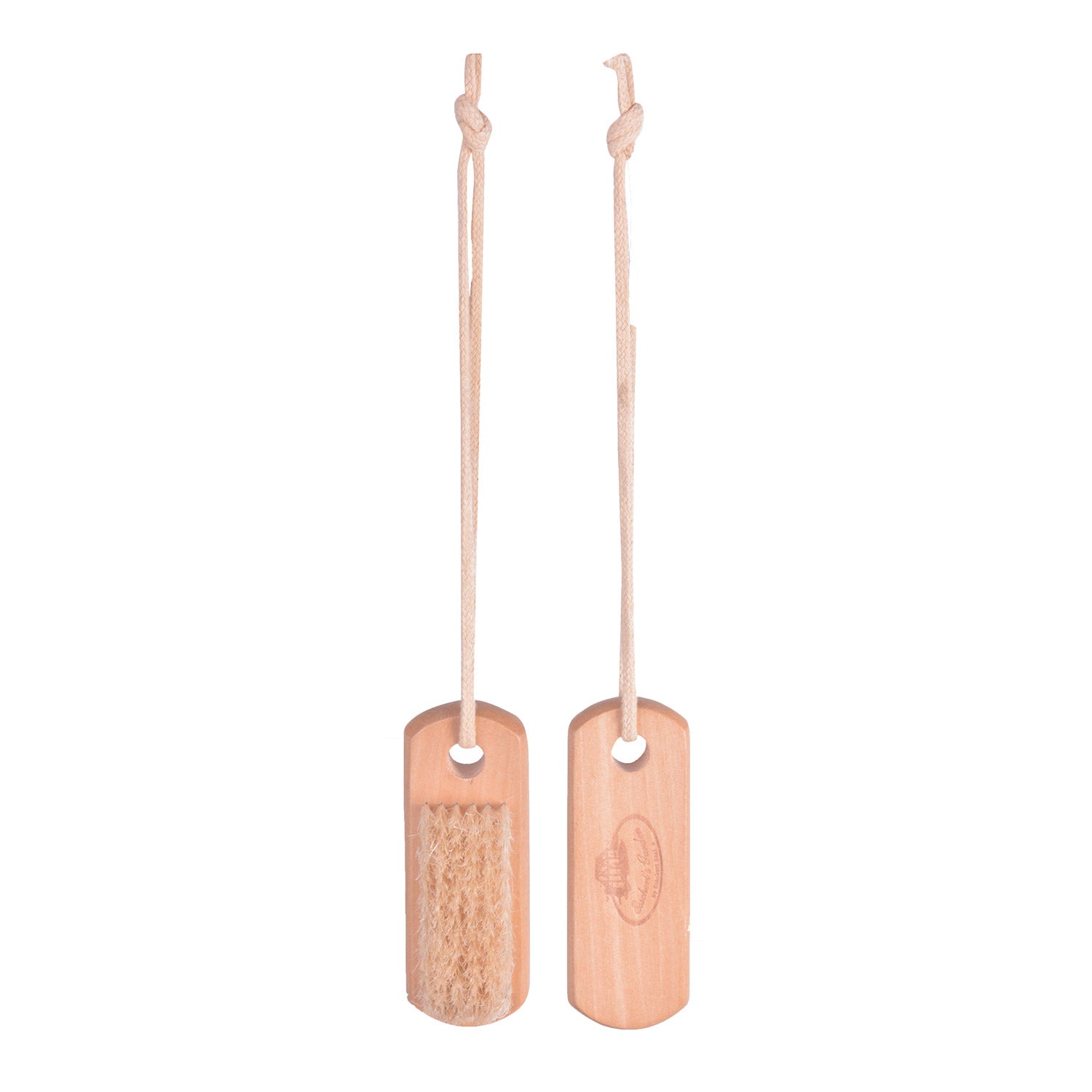 - Nagelborstel met ophanglus (bestaande uit schima superba hout, varkenshaar, katoenen koord)