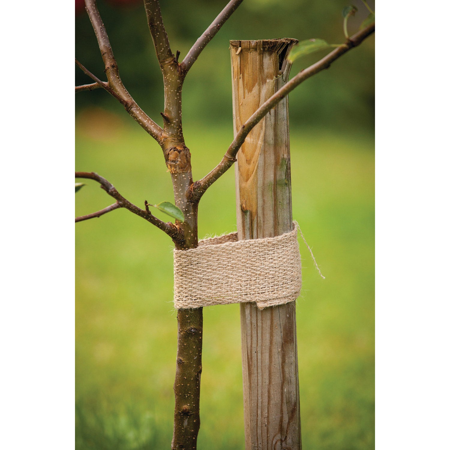 Si taglia un pezzo della lunghezza necessaria, lo si avvolge con cura attorno al fusto o al ramo e a un supporto come un tutore o una struttura, quindi lo si annoda o ripiega per fissarlo in modo stabile senza stringere. Il nastro è abbastanza flessibile da piegarsi attorno alle curve e sufficientemente largo da non incidere. La fascia in juta offre una buona presa senza danneggiare la pianta.
