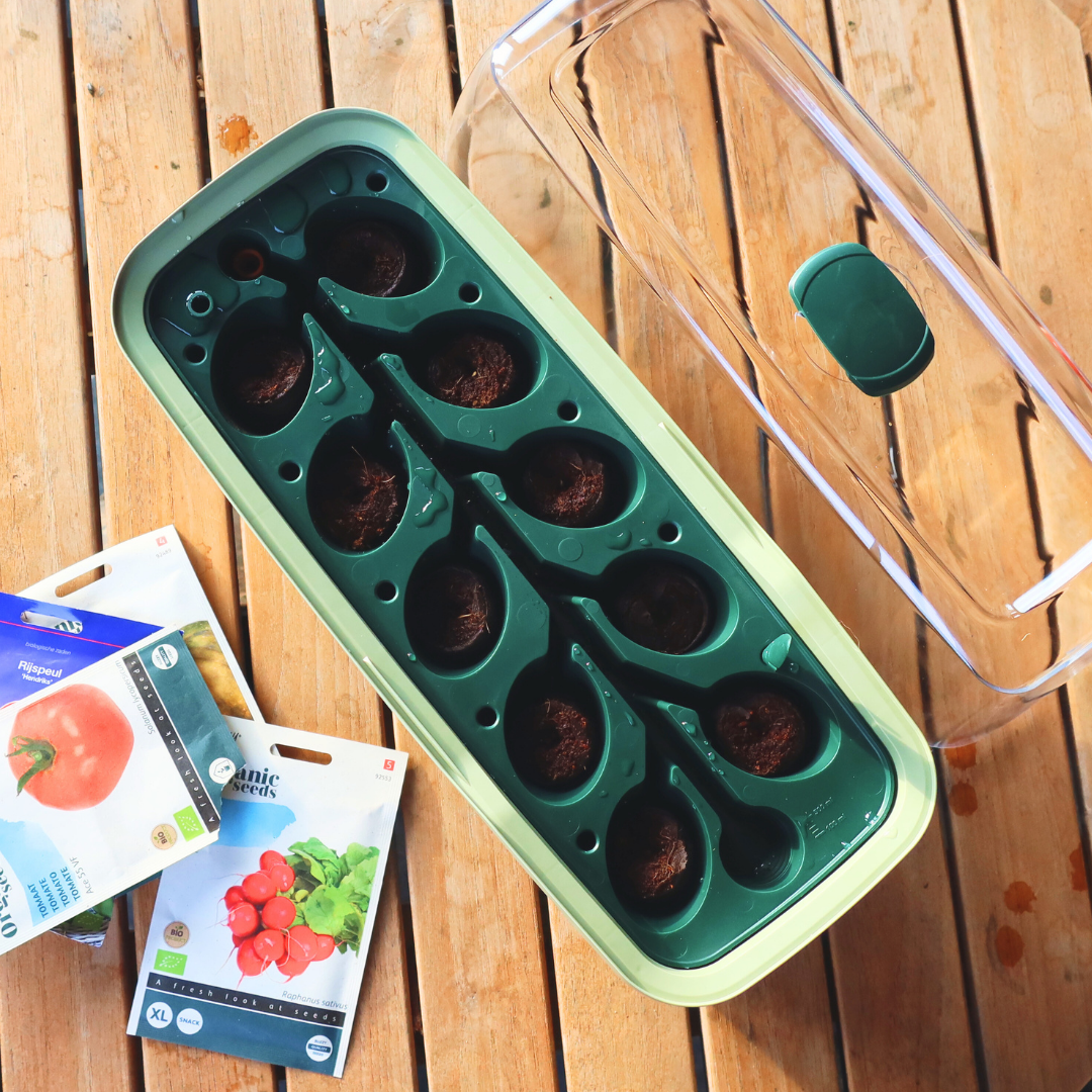L’utilizzo è studiato e semplice: posizionate le pastiglie di coltivazione nell’apposito vassoio, riempite la canaletta dell’acqua, seminate i semi, chiudete il coperchio e il gioco è fatto. Il vassoio mantiene le pastiglie saldamente in posizione quando assorbono acqua e offre alle giovani piante una stabilità aggiuntiva. L’ingegnoso sistema di irrigazione Water-Stop previene i ristagni: l’acqua in eccesso viene scaricata tramite un troppo pieno, mentre fessure e intagli garantiscono una distribuzione uniforme dell’acqua. L’apertura di irrigazione integrata consente di annaffiare con il coperchio chiuso, senza perdite né condensa sulla superficie sottostante. In questo modo si crea un microclima stabile ed equilibrato, in cui le piante crescono in modo ottimale.