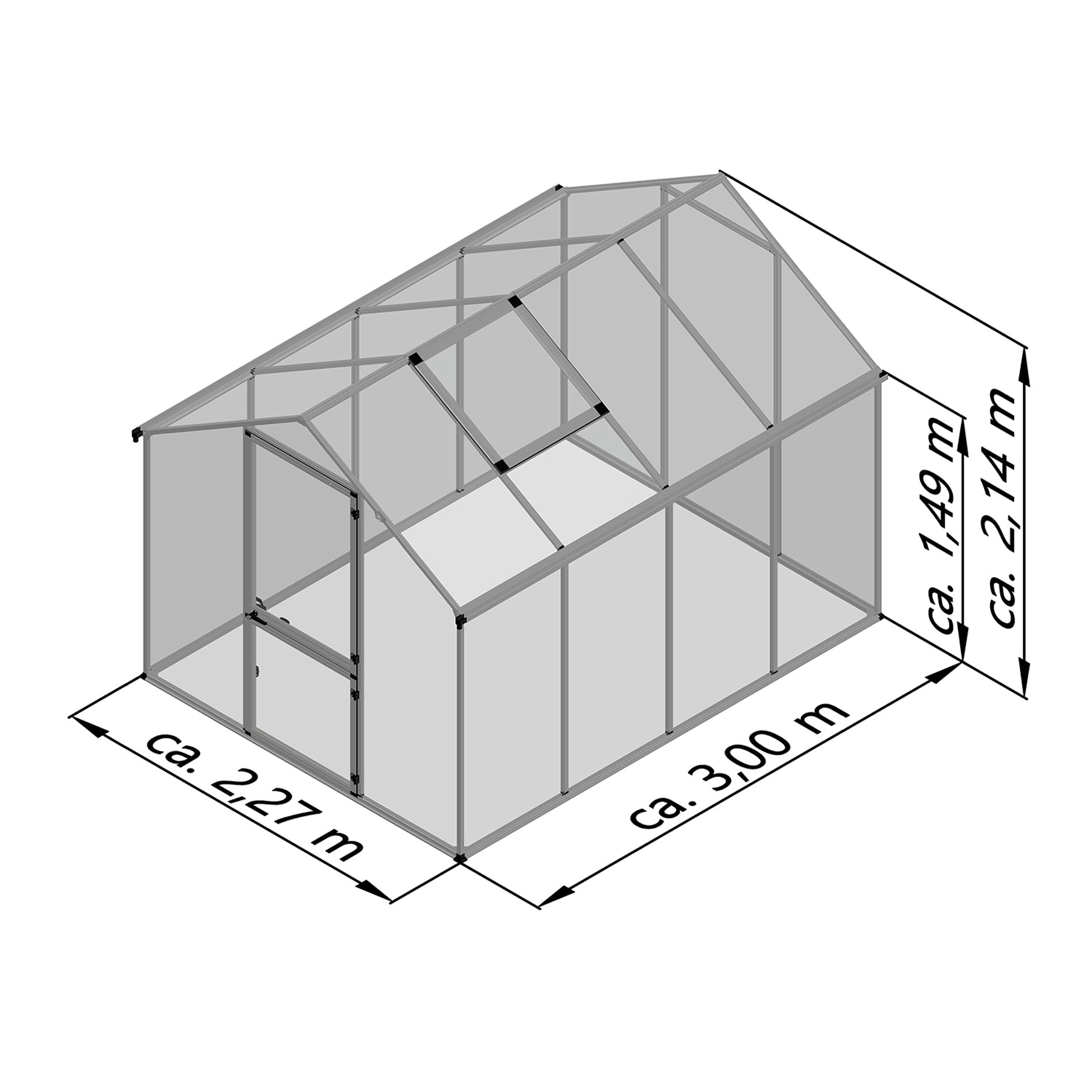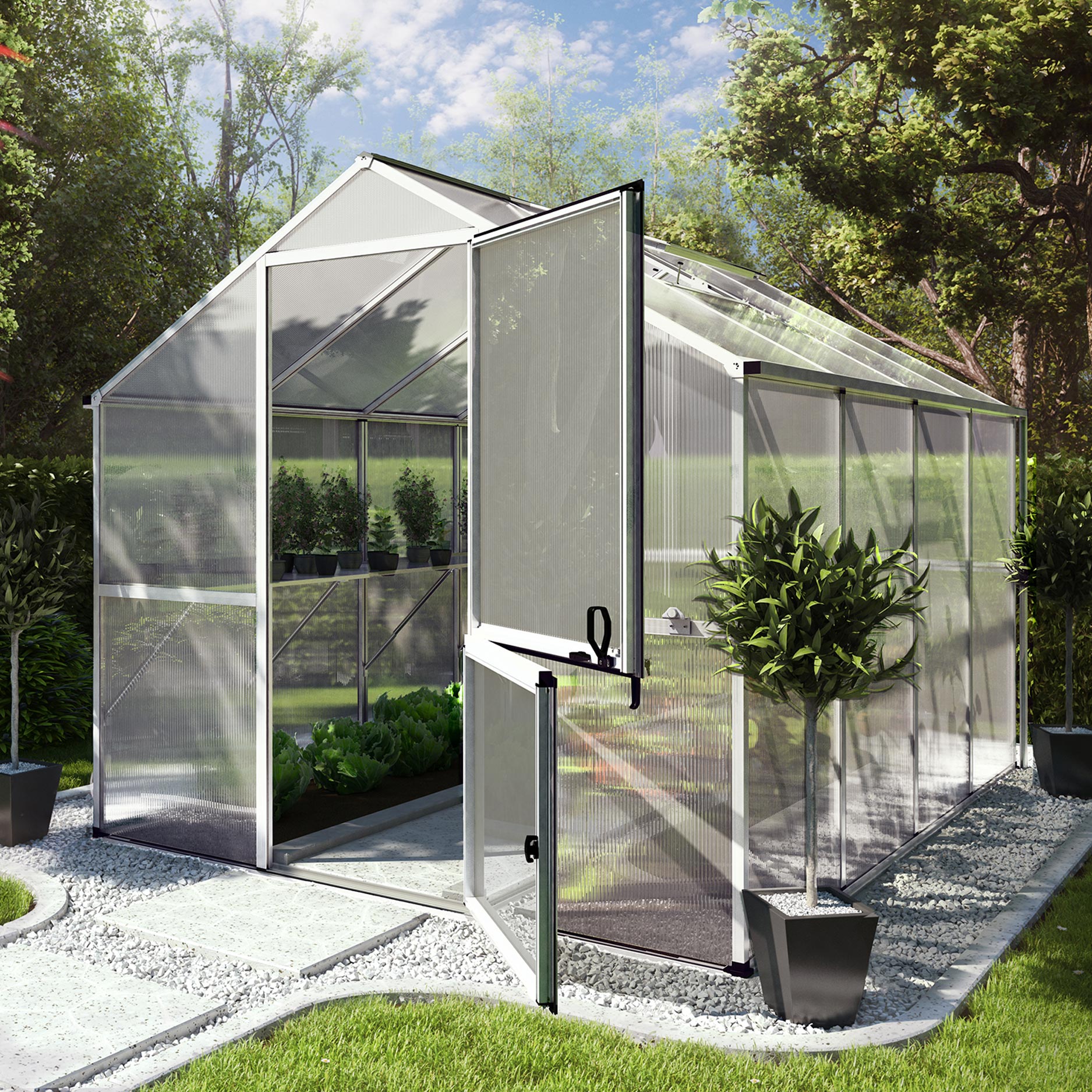 La serie è composta da 2 modelli ed è fornita di serie con pannelli alveolari da 6 mm, che assicurano un buon isolamento, protezione UV e un microclima di crescita stabile sia a inizio che a fine stagione. Tutte le versioni dispongono di un’ampia porta a battente, finestra sul tetto e grondaie integrate, abbinate a una struttura in alluminio leggera ma molto stabile.