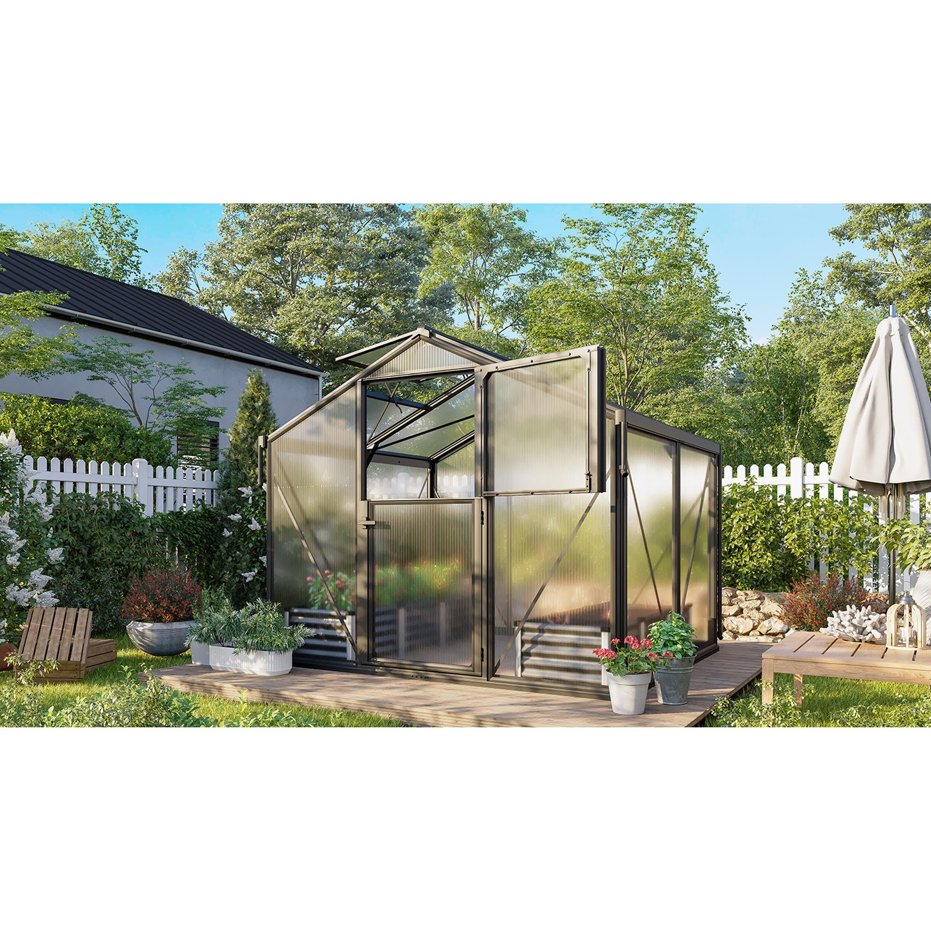 Die Konstruktion besteht aus robustem Aluminium mit zusätzlich verstärkten Profilen und einer innovativen Montage über Aluminium-Klemmprofile, bei der die Paneele zwischen Leisten geklemmt werden, um die Kanten maximal vor Schmutz und Abnutzung zu schützen. Die Verglasung besteht aus einer Kombination aus 10 mm Hohlkammerplatte im Dach und 3 mm Sicherheitsglas in den Seitenwänden, was für ein optimales Gleichgewicht zwischen Lichtdurchlass, Isolierung und Langlebigkeit sorgt. Ausserdem ist das Gewächshaus standardmässig mit Regenrinnen, Regenfallrohren und einem Dachfenster ausgestattet. Dank der geteilten Stalltür ist natürliche Belüftung einfach möglich, selbst ohne die Tür ganz zu öffnen.