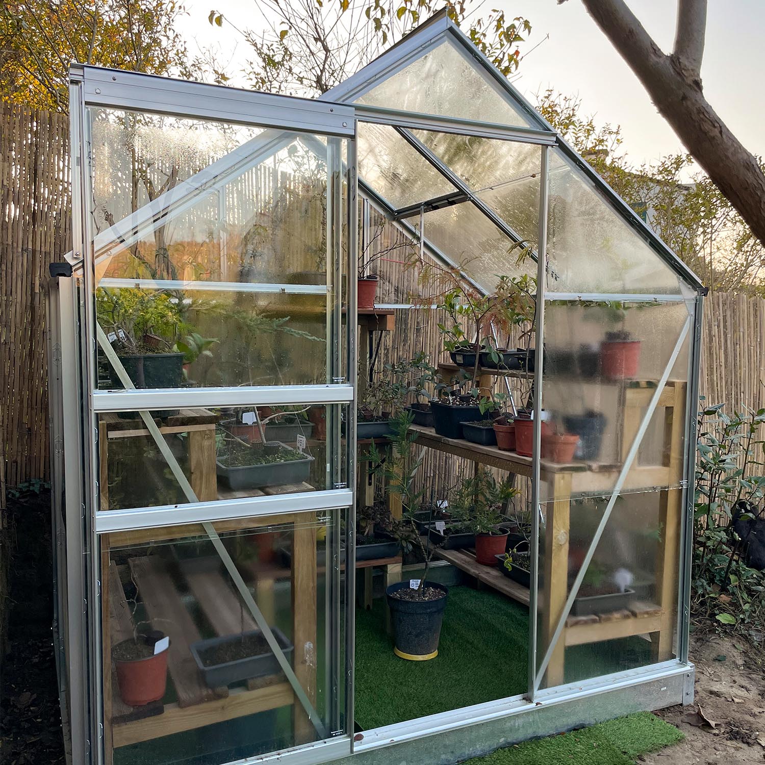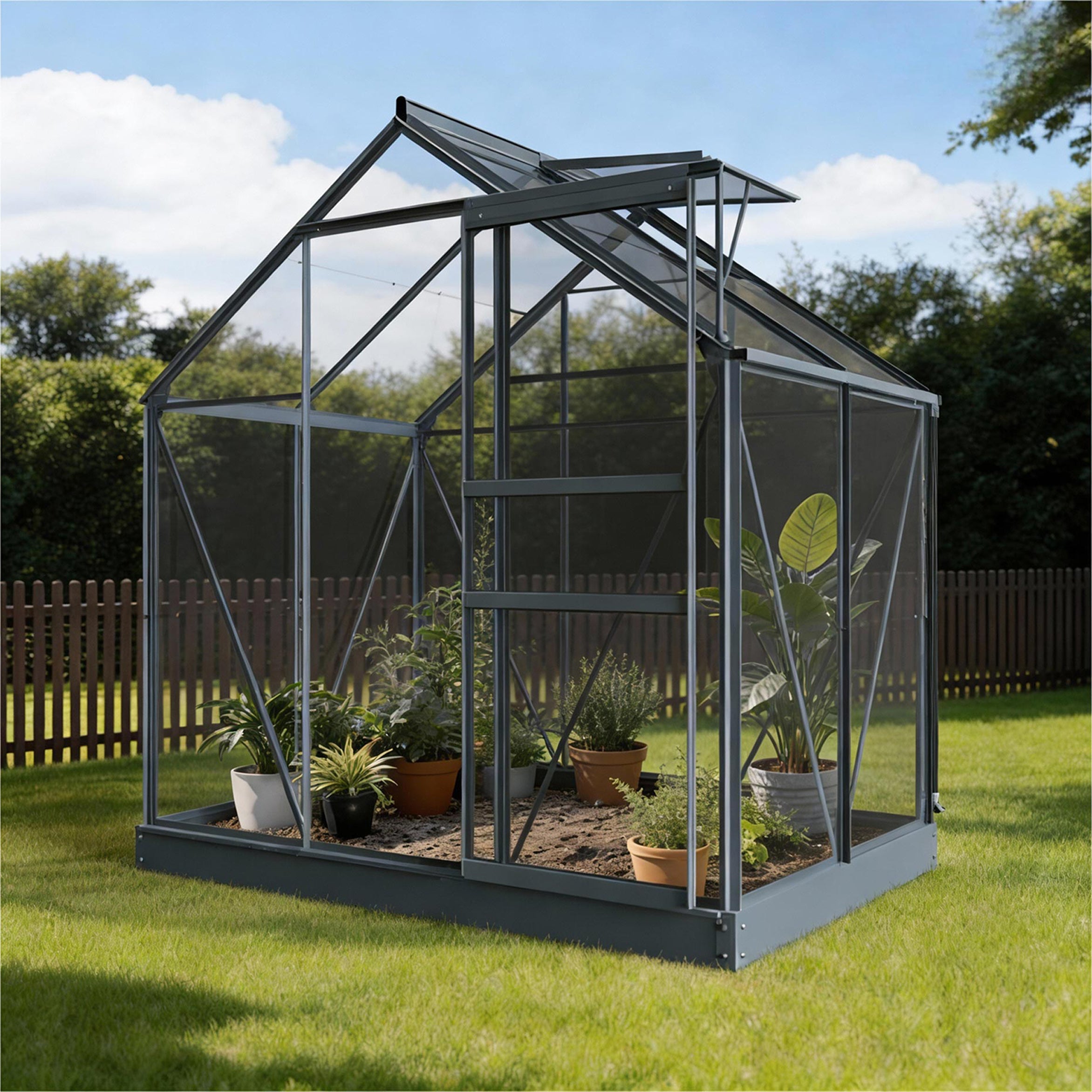 La struttura in alluminio risulta solida e stabile, con vetro di sicurezza da 3mm che lascia passare molta luce ed è facile da pulire. La porta scorrevole e la finestra sul tetto garantiscono una ventilazione naturale e un microclima interno piacevole. Il telaio di fondazione e lo scarico dell’acqua piovana sono inclusi di serie, così la serra è subito pronta all’uso. Piccola nelle dimensioni, grande nelle possibilità.