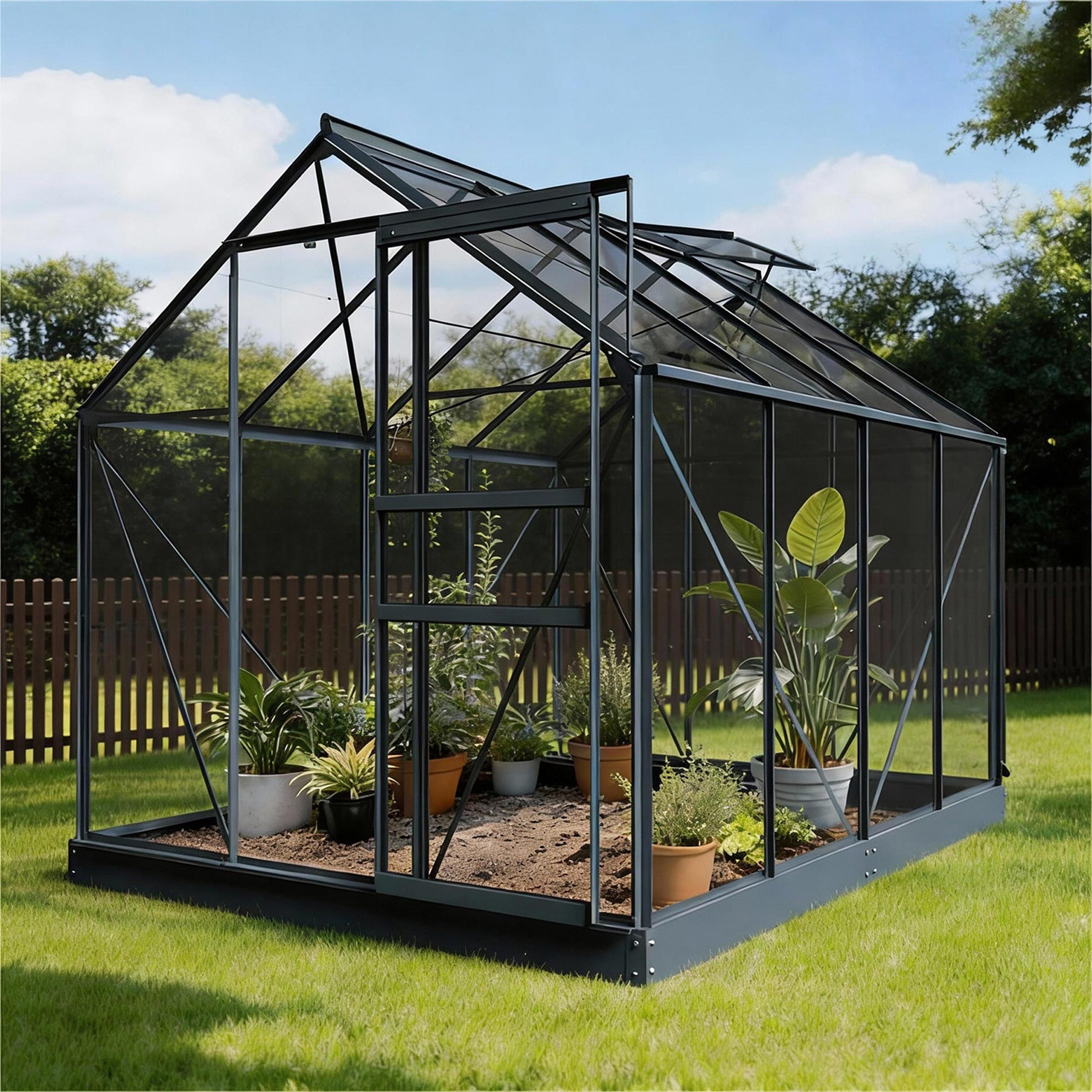 La struttura in alluminio con vetro di sicurezza da 3mm risulta solida e affidabile, anche con vento o pioggia. La porta scorrevole scorre con fluidità e la finestra sul tetto assicura un clima interno piacevole. Grazie al telaio di fondazione, la serra è stabile su qualsiasi superficie, mentre il doppio sistema di scarico dell’acqua piovana convoglia l’acqua in modo ordinato o la raccoglie per il riutilizzo. In questo modo, l’Allium unisce praticità e sostenibilità, con un aspetto discreto e curato in giardino.