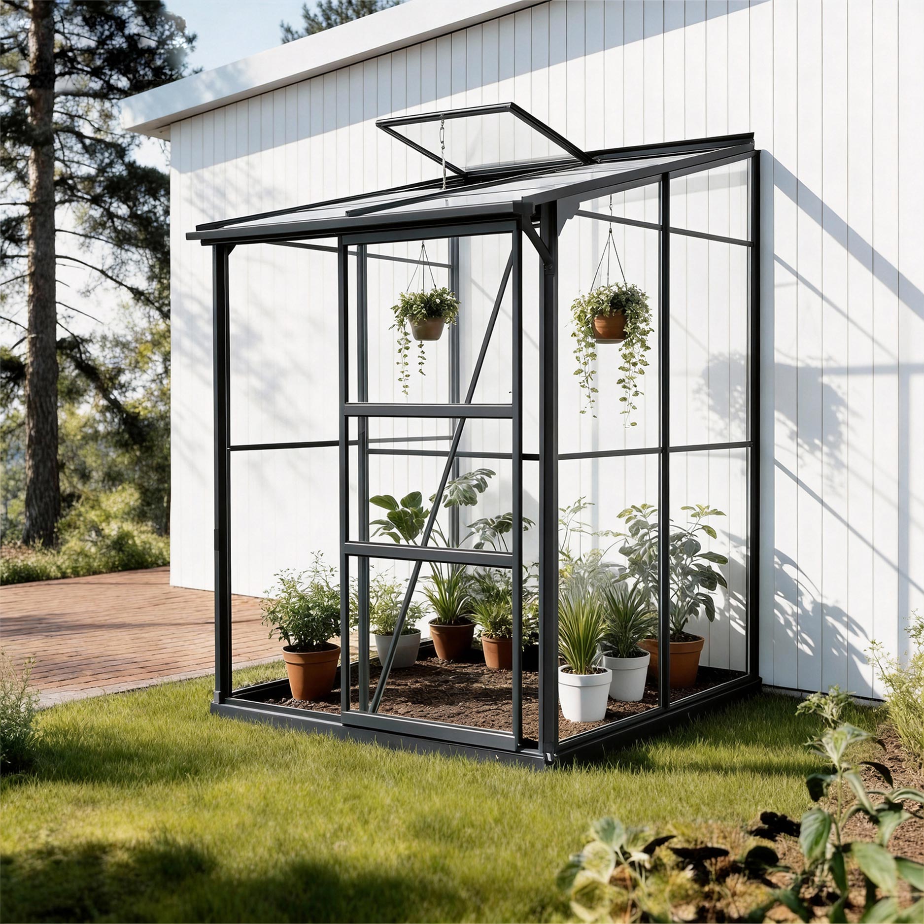 La struttura in alluminio con vetro di sicurezza è durevole e richiede poca manutenzione. La porta scorrevole scorre in modo fluido e la finestra sul tetto garantisce aria fresca. Il telaio di fondazione e lo scarico dell’acqua piovana sono inclusi, così la serra è pronta all’uso. Pratica, durevole e bella in ogni giardino.