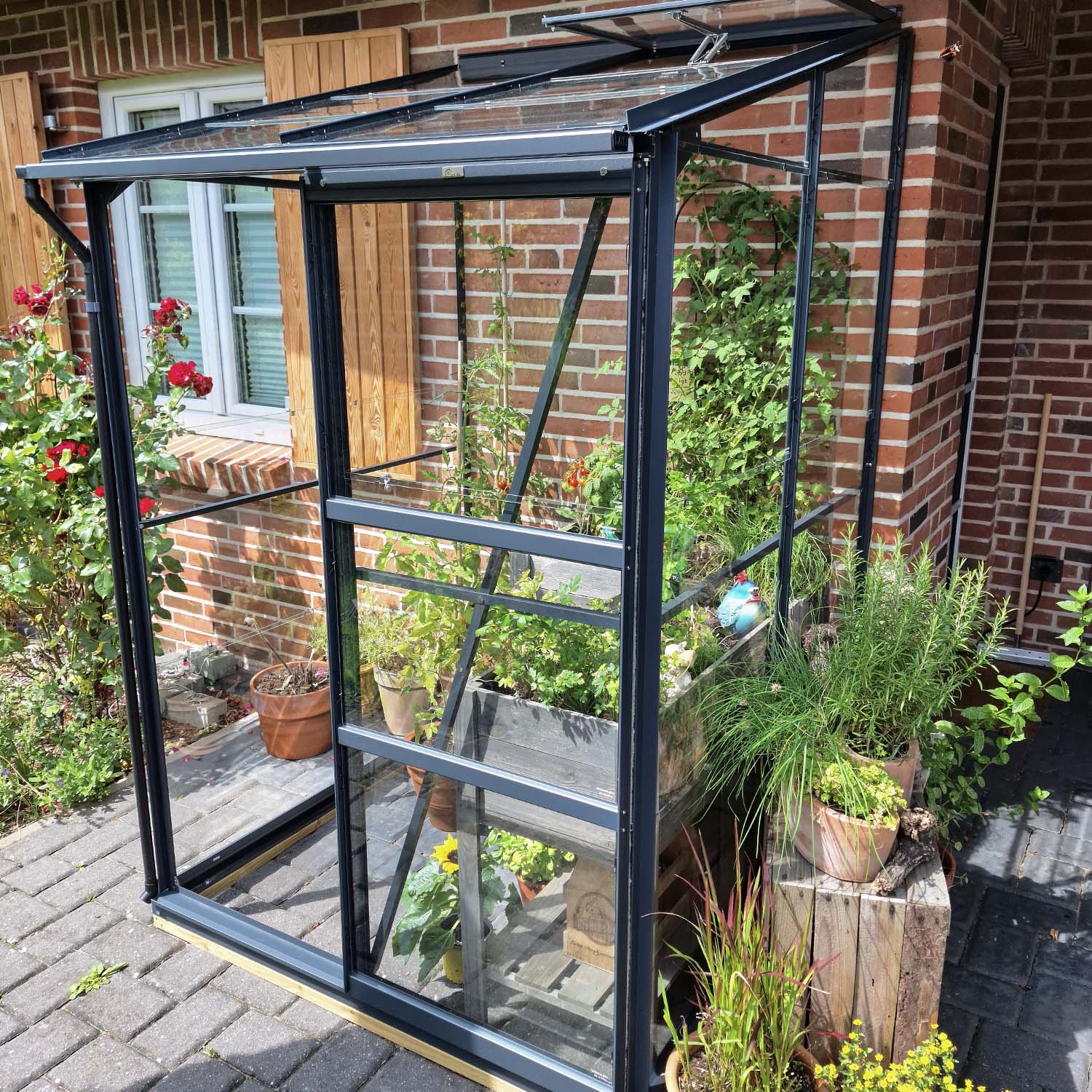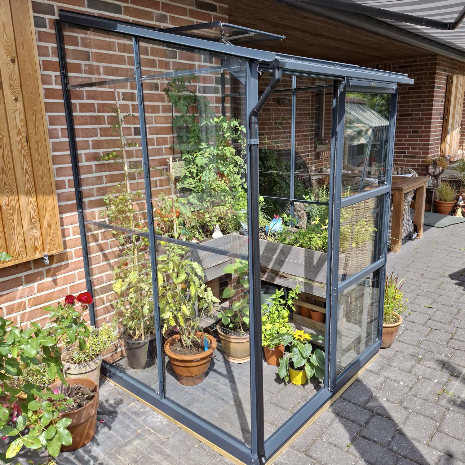 La Melissa 1,70m² è una pratica serra a muro per chi vuole fare qualcosa in più anche con spazio limitato. C’è posto per vassoi da semina, erbe aromatiche e giovani piante, ma anche per far svernare le colture più sensibili. Grazie al posizionamento contro un muro caldo, il clima rimane stabile e la crescita è leggermente più rapida.