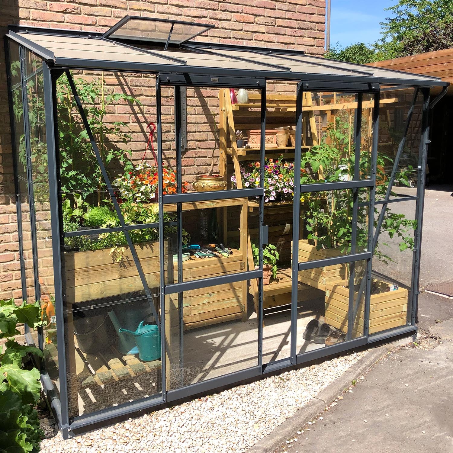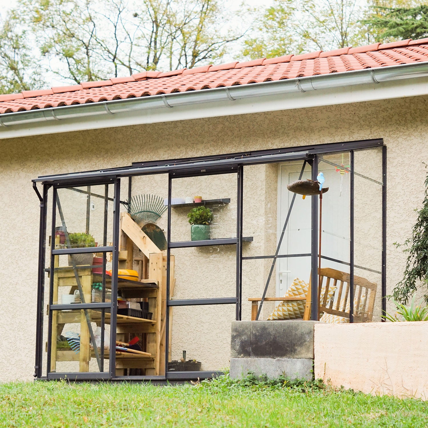La struttura in alluminio con vetro di sicurezza è stabile, richiede poca manutenzione e garantisce un’elevata luminosità. La porta scorrevole e la finestra sul tetto rendono semplice l’aerazione, mentre lo scarico dell’acqua piovana convoglia ordinatamente la pioggia. Grazie al telaio di fondazione, la serra risulta solida e affidabile, così potrà godere stagione dopo stagione di una crescita sana.
