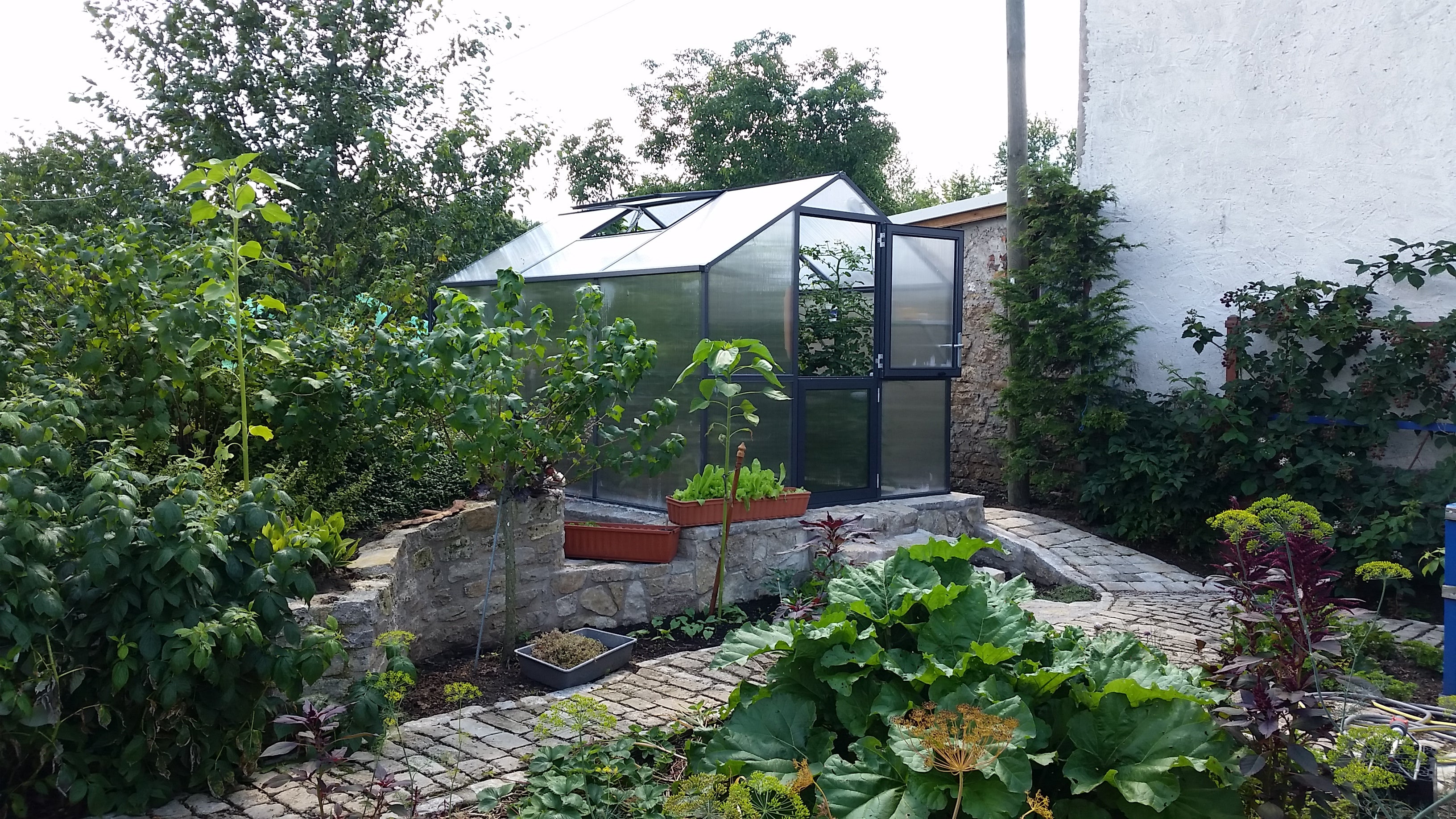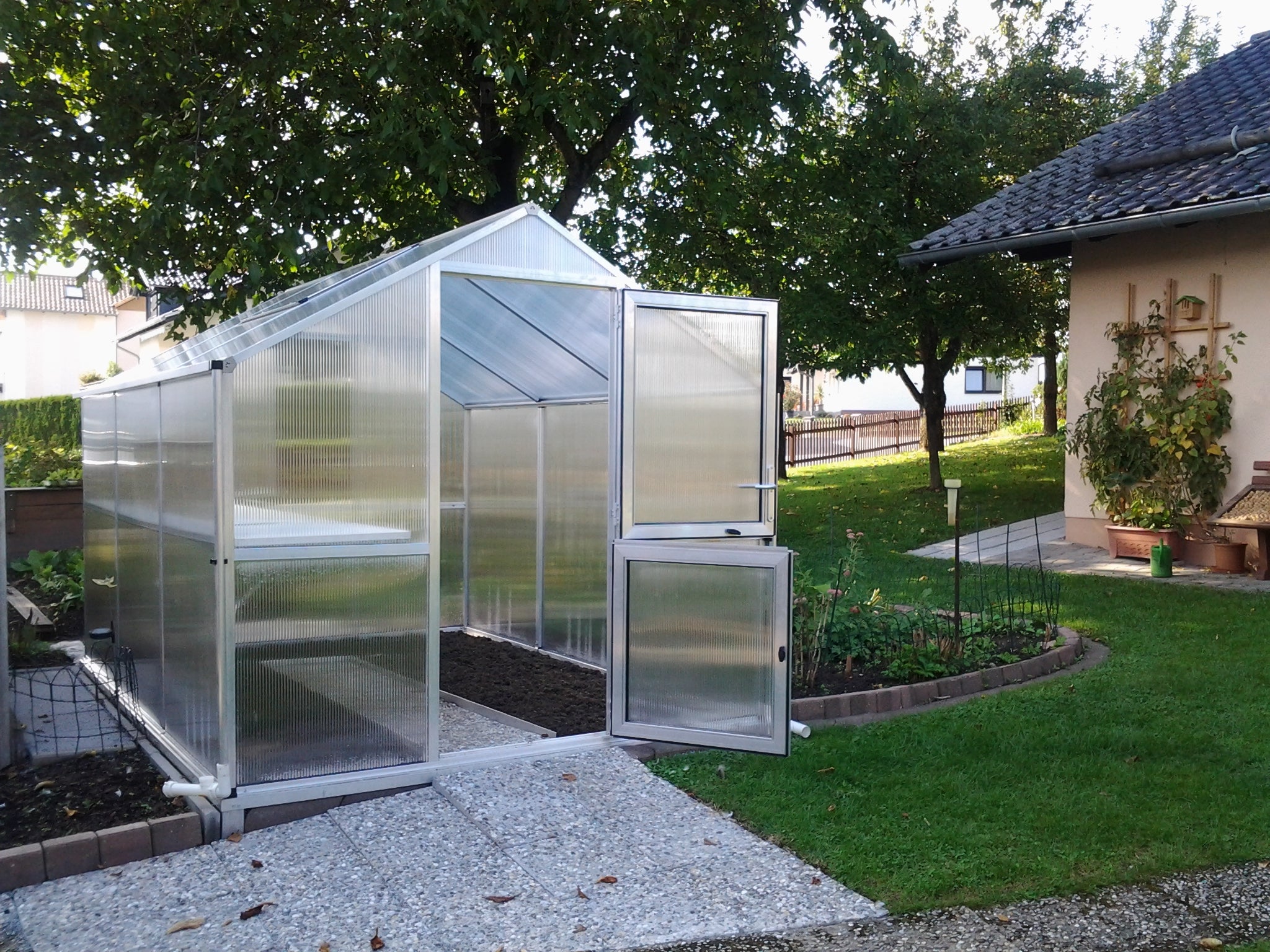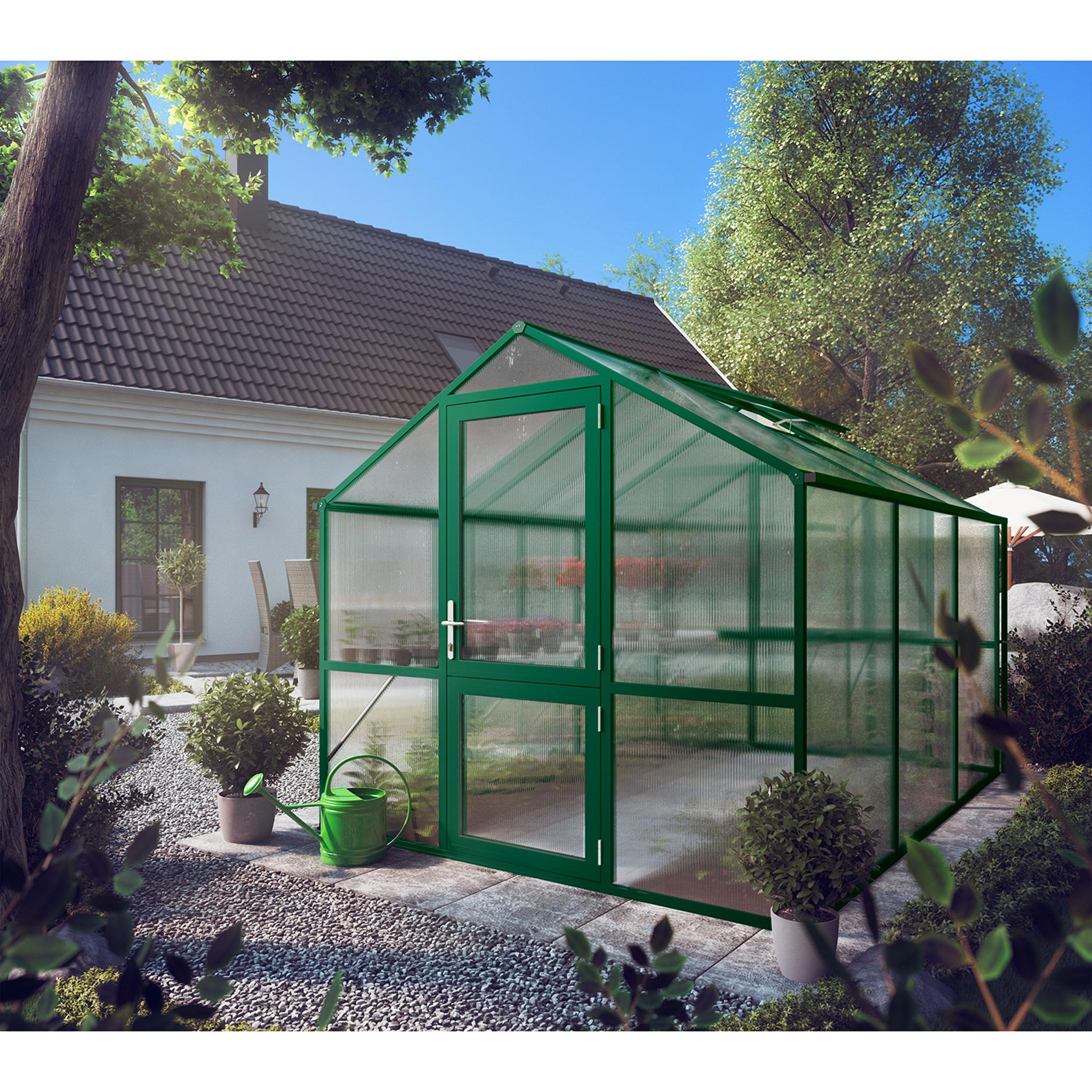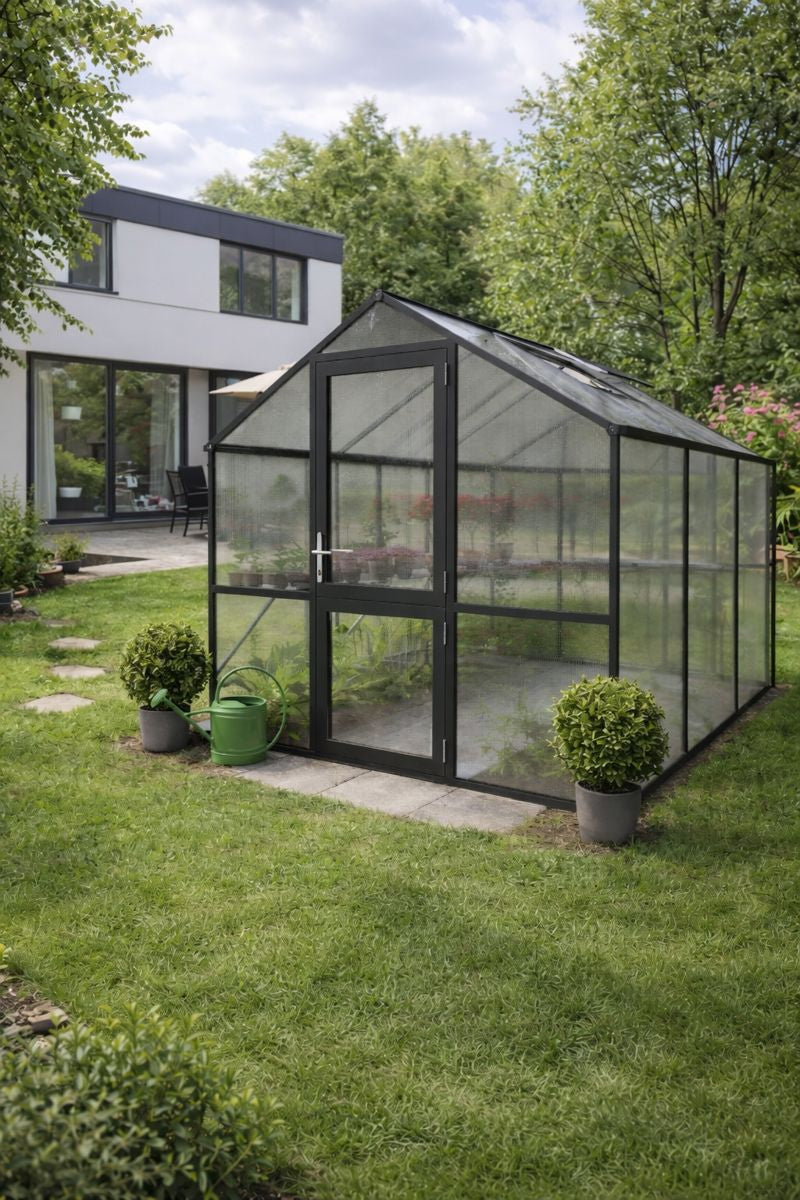 La struttura è realizzata in robusto alluminio, leggero ma eccezionalmente resistente. I pannelli alveolari da 10mm trattengono il calore e riducono le oscillazioni di temperatura, particolarmente utili all’inizio della primavera e a fine autunno. Grazie alla protezione UV, i pannelli restano trasparenti e mantengono per anni le loro proprietà isolanti. L’ampia porta a battente e la spaziosa finestra sul tetto offrono accesso e ventilazione confortevoli. Le grondaie integrate convogliano l’acqua o la permettono di essere raccolta per il riutilizzo. Con il telaio di fondazione si ottiene una base solida e durevole, adatta a un uso intensivo.