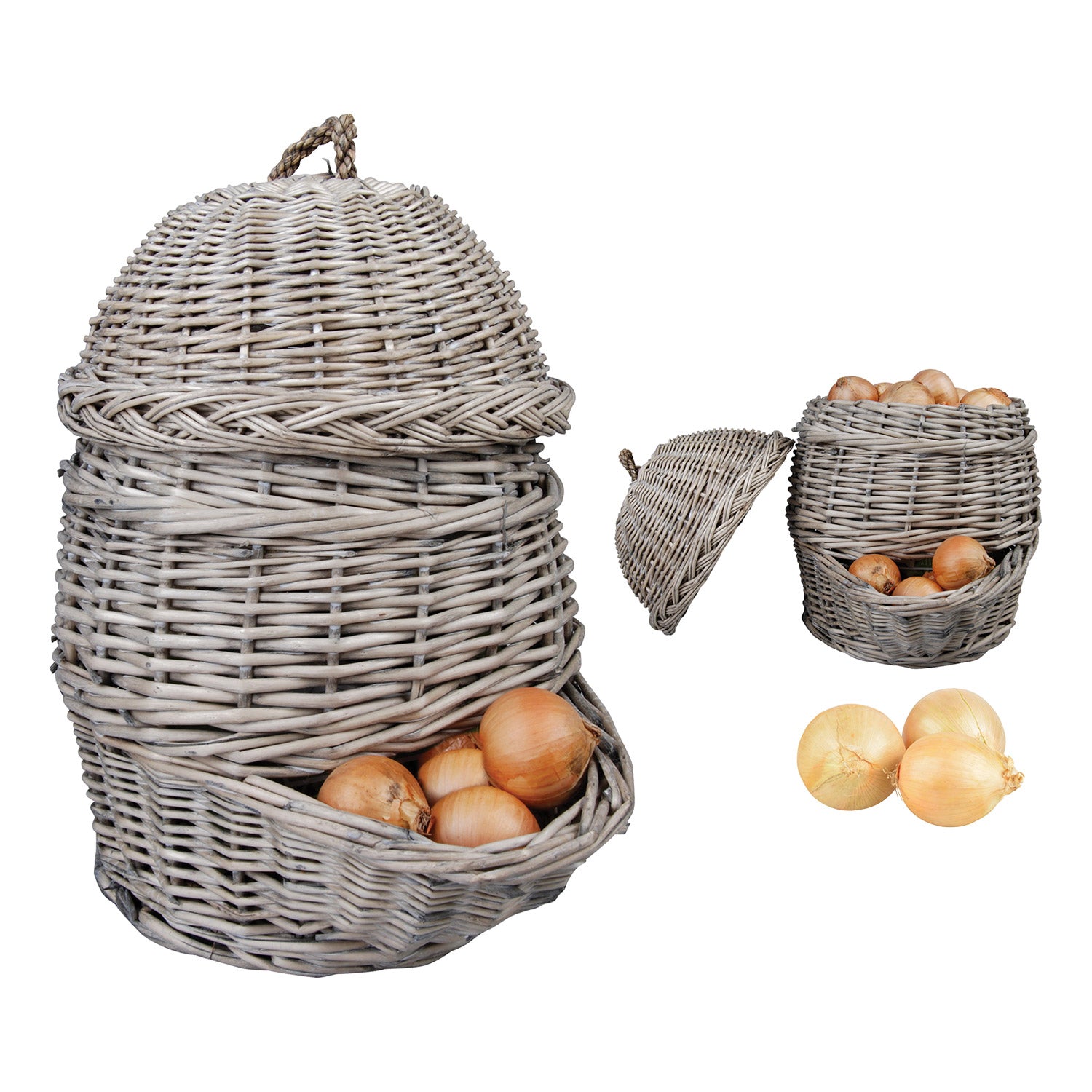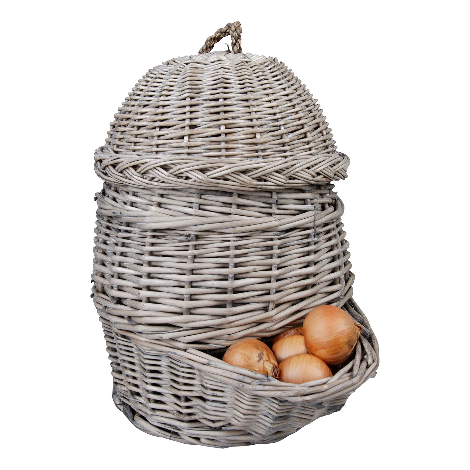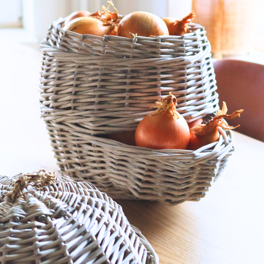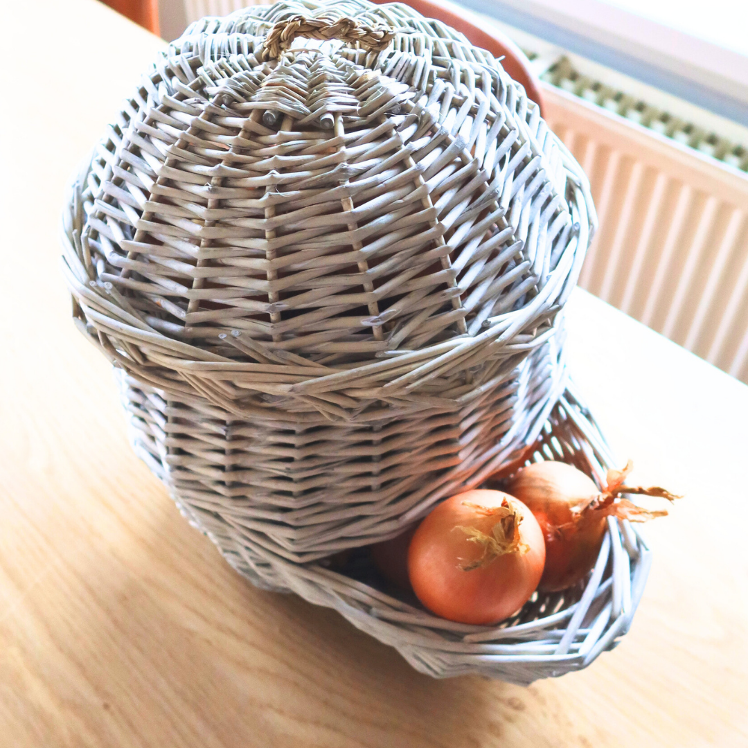 Con questo cestino autentico e decorativo, le cipolle possono essere conservate in modo ideale in cucina, in ripostiglio o in cantina, con un rischio ridotto di germogliamento. Grazie alla struttura aperta, il raccolto è ben ventilato e rimane fresco più a lungo. Grazie all’ottima apertura, dal cestino esce sempre per prima la scorta più vecchia. Il raccolto fresco va posizionato nella parte superiore del cestino rimuovendo il coperchio. Oltre alle cipolle, in questo cestino si possono conservare, ad esempio, anche mele e patate.