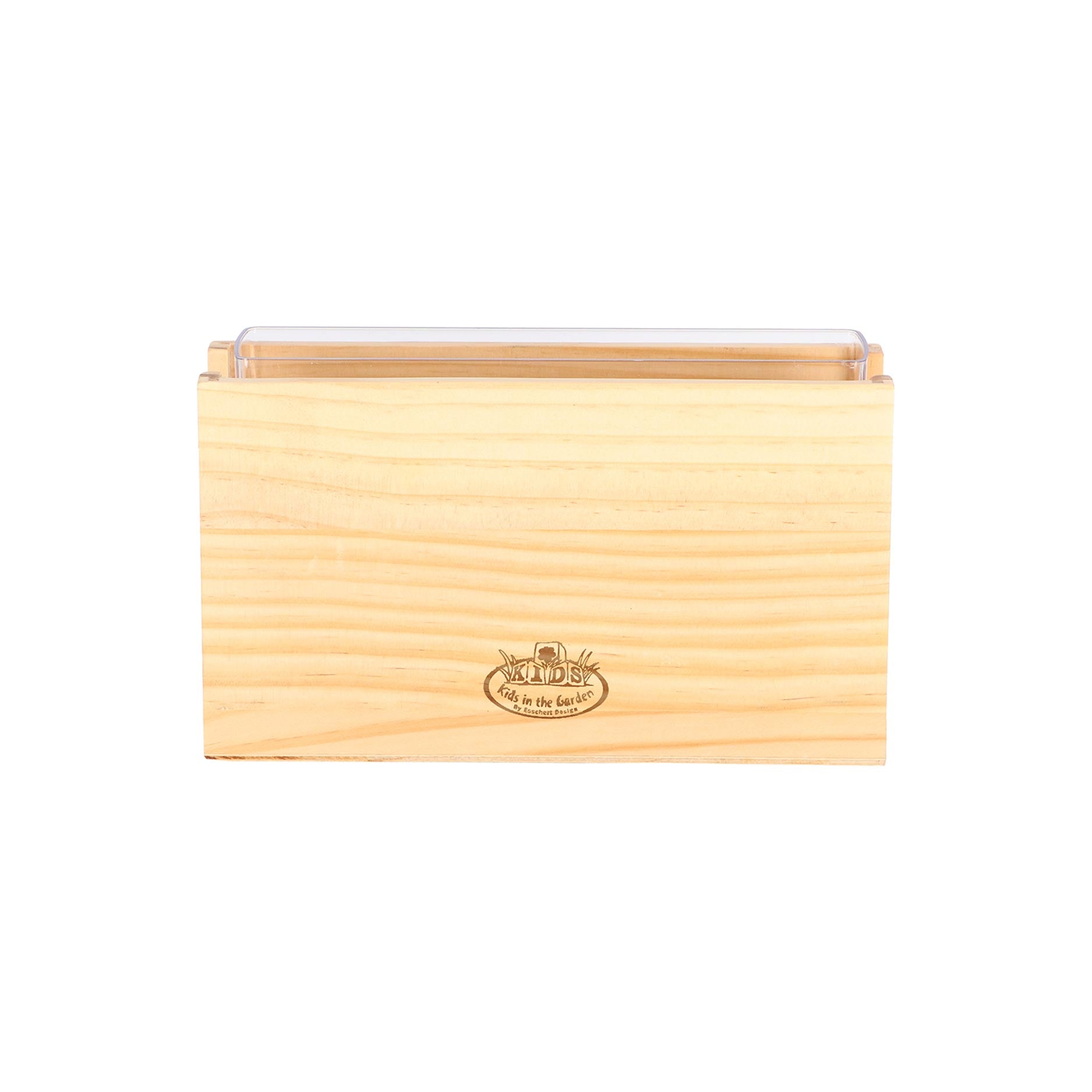 Questa intelligente cassetta di coltivazione ha un robusto involucro in legno che mantiene le radici al buio, proprio come in natura. Nell’involucro è inserita una vaschetta trasparente rimovibile, così potrete osservare le radici mentre crescono, senza dover smontare l’intera piantina. In questo modo i bambini scoprono giocando come le radici si ramificano, come assorbono l’acqua e come una pianta si ancora al terreno.